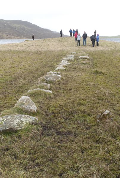 Tingaholm was once an islet entirely surrounded by water and accessed by a stone causeway. In the 1850s the water levels in the loch were lowered, and the holm evolved into its present form. By 1774 the stone seats had been ripped up in order to make space for grazing, but the remains of the causeway can still be seen today.