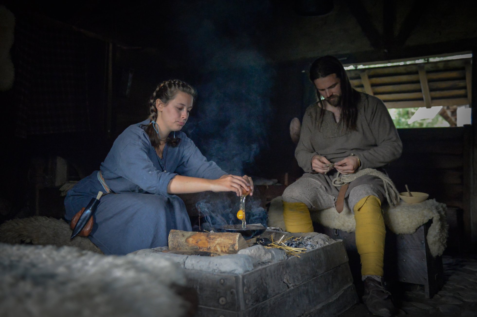 The house of this merchant from Dorestad is largely made of wood. In combination with the reed on the roof it makes a dangerous place for open fires. That is why the fire pit is located in the middle of the room, so that the smoke can escape through the ‘ow holes’ in the roof. The fire has been raised so that it is easier to cook on.