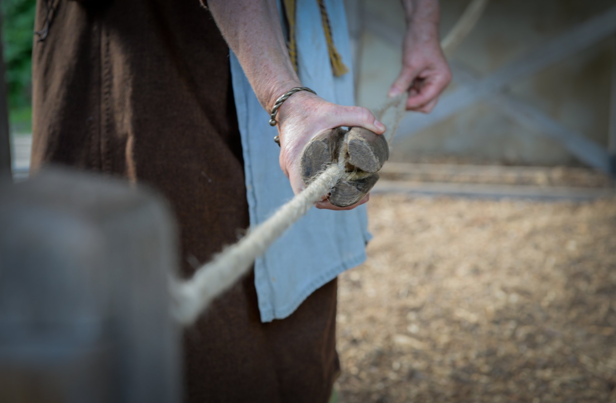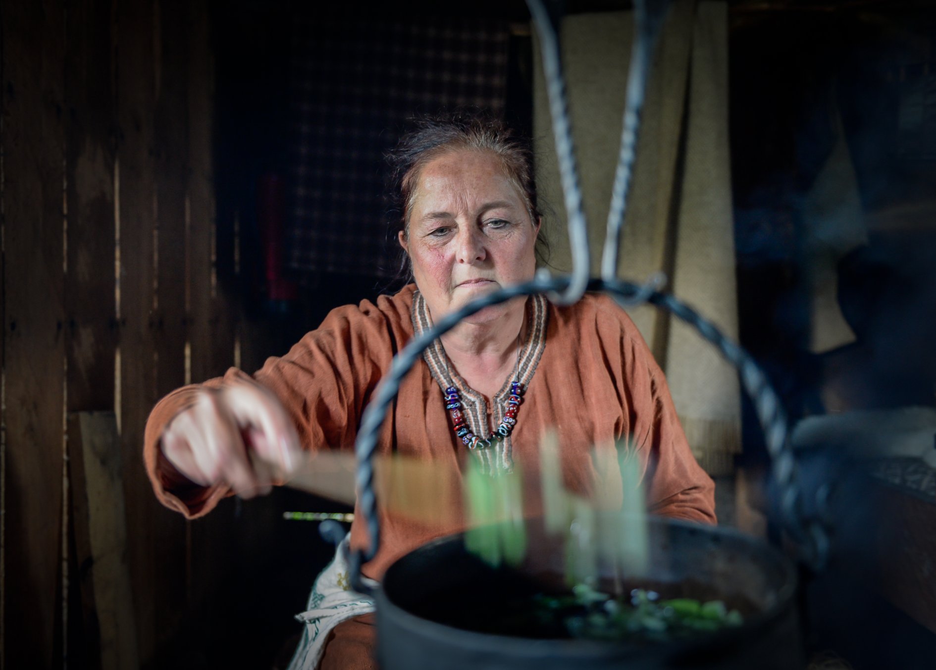The house of this merchant from Dorestad is largely made of wood. In combination with the reed on the roof it makes a dangerous place for open fires. That is why the fire pit is located in the middle of the room, so that the smoke can escape through the ‘ow holes’ in the roof. The fire has been raised so that it is easier to cook on.