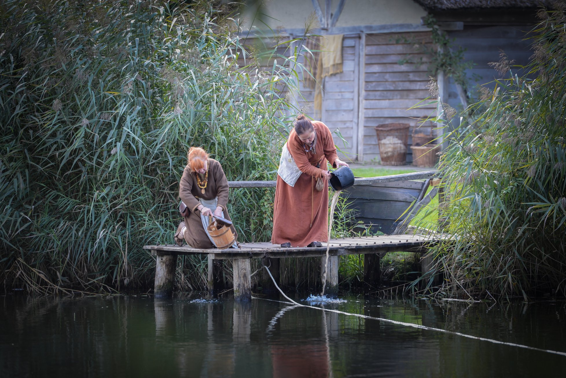 Up front, closest to the water, stands a merchant house with a thatched roof. This home is modeled like those found in Hedeby (Dk) in archaeological research. Right behind the house is a so-called hutkom. This is a building that is only used as a workshop, for example, by a glass bead maker or blacksmith. This hutkom was excavated in Rijnsburg. The main building is a semi house with barn work, found in the soil survey in Valkenburg (ZH) whiere the settlement Woerd was discovered in the early Middle Ages.